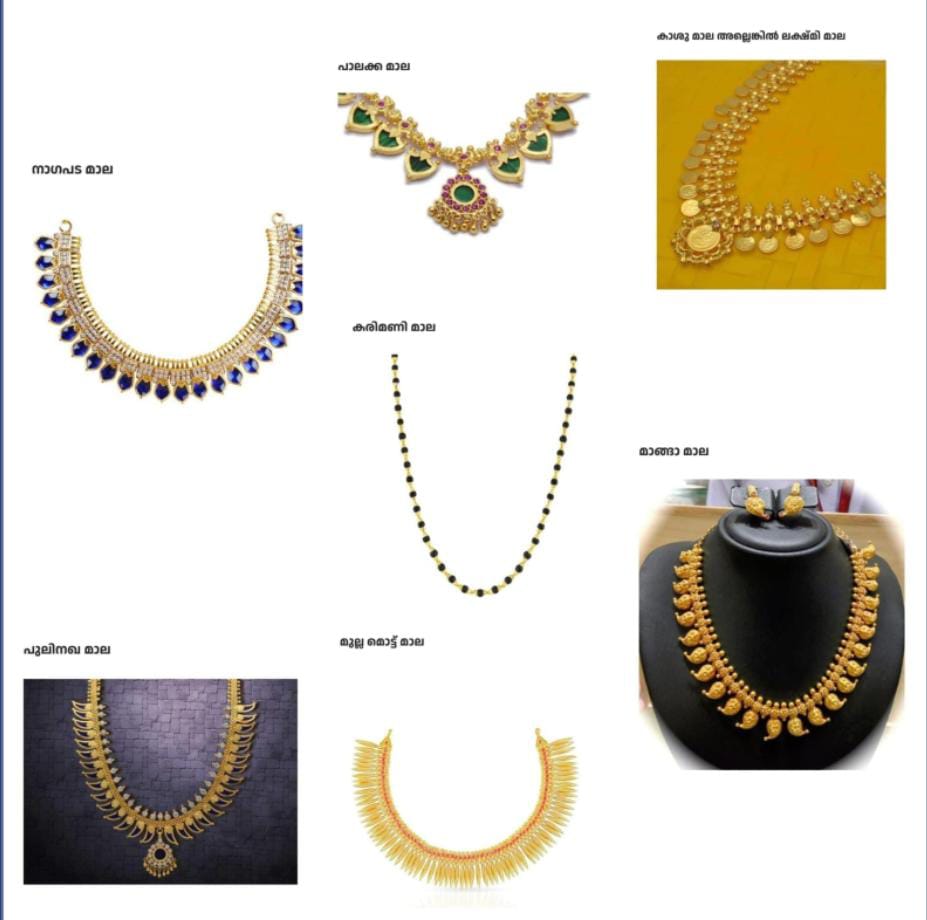 പൂത്താലി, എല്ലാ വിഭാഗക്കാർക്കിടയിലും കാണാം. കാശുമാല, കാശിൻ്റെ ആക്യതിയിൽ രൂപപ്പെടുത്തിയ സ്വർണനാണയം, കോർത്തി ടുന്ന രീതിയാണ്. അവിൽമാല, ചക്കരപ്പതക്കം, (11 കല്ലിൽ പണിയുന്ന പതക്കം-നിറം ഏതുമാവാം) വേപ്പിലുഷ, കാശാലി, ഇളക്കത്തൊലി കയ്പ്പ്പക്കുരുമാല, പണമാല, ചക്രമാല, പവൻമാല, മണിമാല, ചീർപ്പു നിരവധി പ്രചാരത്തിലുണ്ടായിരുന്നു. ഇന്ന് ഈ പഴയ ആഭരണങ്ങളുടെ മാല, തീപ്പെട്ടിമാല, കുഴിഡബ്ബിൾ മാല എന്നിങ്ങനെ കണ്ഠാഭരണങ്ങൾ പുതിയ പതിപ്പുകൾ, കാലഭേദമനുസരിച്ചുള്ള പുതുമകളോടെ കടന്നുവരുന്നു.