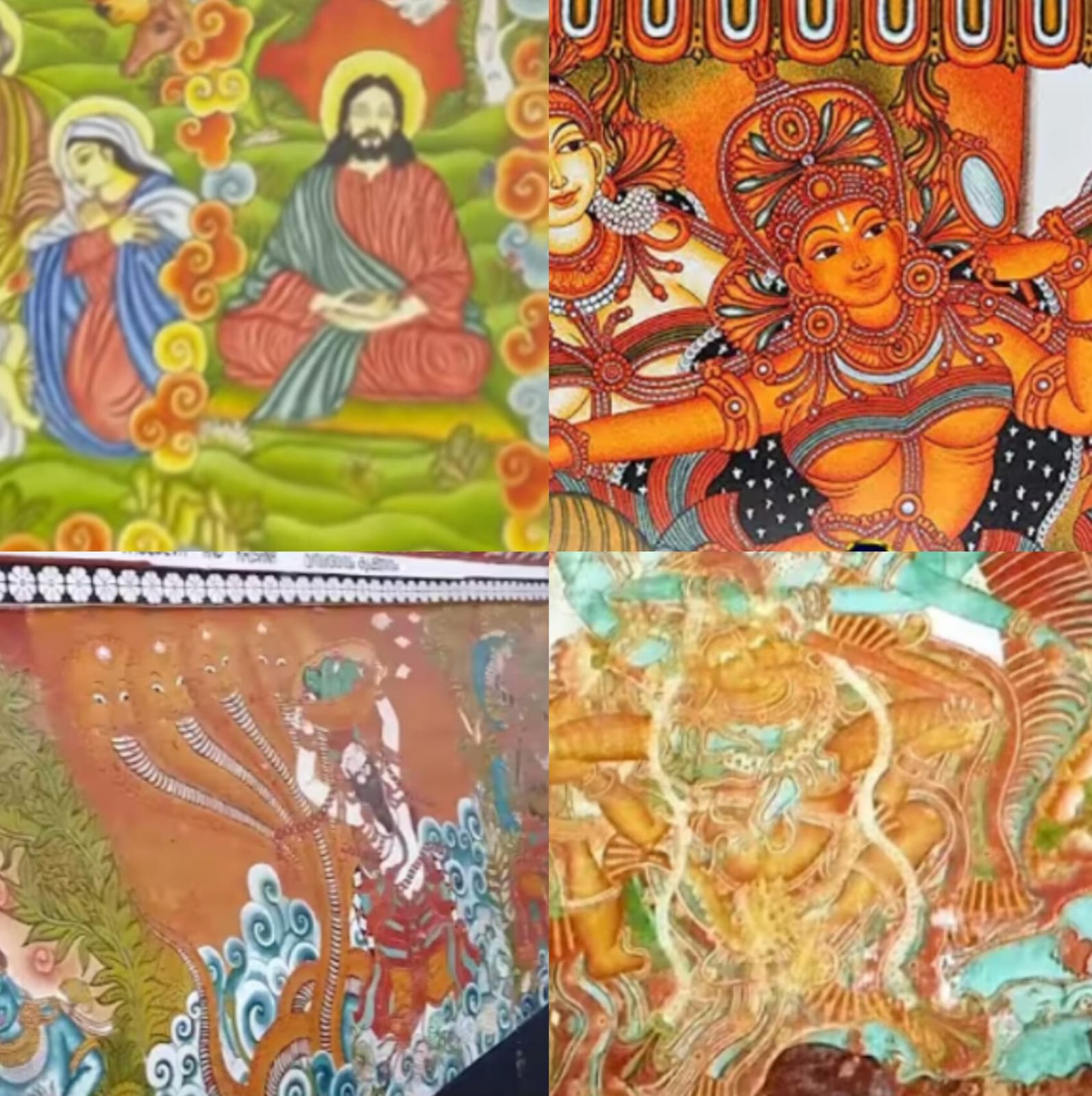 "കേരളത്തിലെ ക്ഷേത്രഭിത്തികളിൽ കാണുന്ന ചുവർച്ചിത്രങ്ങളിൽ പ്രധാനമായും മതാത്മകമായ വിഷയങ്ങൾക്കാണു പ്രാധാന്യം. ദേവീ ദേവന...