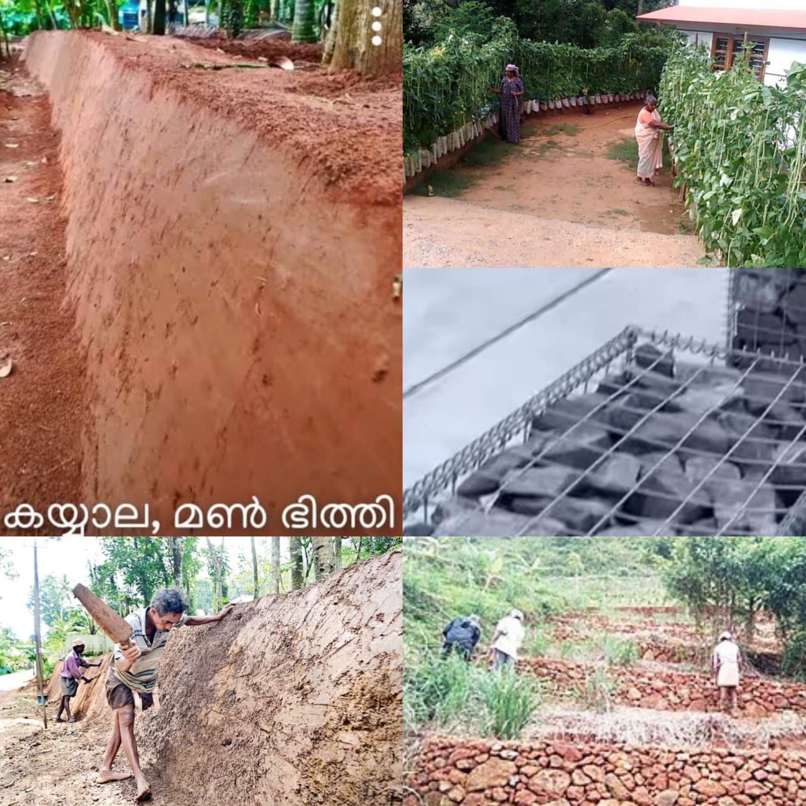 കയ്യാലകൾ: " ഓരോയിടത്തെ പുരയിടവും അതിർത്തികെട്ടി തിരിക്കുന്ന കയ്യാലകൾ മണ്ണുകൊണ്ടുണ്ടാക്കുന്നത് എവിടെയുംപോലെ കേരളത്തിലുമുണ്ട്. മണ്ണു മതിലുകൾ (Mud Walls) ആണവ. പശിമയുള്ള മണ്ണ് പൊത്തിപ്പൊത്തി മതിലാകൃതിയുള്ള കൈയ്യാലകളുണ്ടാക്കും. കയ്യാലയുടെ ഇരുവശവും കൈകൊണ്ടോ ഏതെങ്കിലും പരന്ന ഉപകരണംകൊണ്ടോ കഴിയുന്നത് മിനുസപ്പെടുത്തും. മിനുസമുള്ള പ്രതലത്തിൽ മഴ വീണാൽ ഒലിച്ചുപൊയ്ക്കൊള്ളും. കയ്യാലയ്ക്ക് വലിയ കേടു സംഭവിക്കില്ല. ഓരോ കൊല്ലവും മഴക്കാലം കഴിഞ്ഞാൽ കേടായ ഭാഗം വീണ്ടും മണ്ണുപൊത്തി നേരെയാക്കും. കയ്യാലയ്ക്ക്/ മൺമതിലിന് മേൽക്കൂര വെക്കുന്ന പതിവുണ്ട്. മെടഞ്ഞ തെങ്ങോലയോ മറ്റേതെങ്കിലുമോ മൺമതിലിൻ്റെ മുകളിൽ മതിലിന്റെ നീളം മുഴുവനും വെക്കും.മതിലിന്റെ മുകളിൽ മഴവെള്ളം നേരിട്ടുവീണു മണ്ണ് കുത്തിയൊലിക്കാതെ അത് ഒരു സംരക്ഷണകൂരയായി നിലകൊള്ളും. ചില കയ്യാല മതിലുകൾ കല്ലുകൾ ഒന്നിനു മുകളിൽ ഒന്നായി പടുത്തുയർത്തിയതാകും. അത് ഒന്നാകെ മണ്ണു കൊണ്ടു പൊതിഞ്ഞ് കൂടുതൽ ഉറപ്പാക്കും. അല്ലെങ്കിൽ കല്ലുകൾ കൂട്ടി വെക്കുമ്പോൾ മണ്ണുനിറച്ച് 'പൊത്തടയ്ക്കും '. ഇന്നും മതിലിന് കല്ലുകൾ കൂട്ടിവെച്ച് ഉയർത്തുമ്പോൾ കല്ലുകൾക്കിടയിലെ സ്ഥലം നിറയ്ക്കാൻ മണ്ണുപയോഗിക്കുന്നുണ്ട്. ഈ മണ്ണുകളിൽ ചെറു സസ്യം വളരും. ഇവയുടെ വേരുകൾ ഭിത്തിക്കുള്ളിലേക്കിറങ്ങി മണ്ണിനെ കൂടുതൽ ബലപ്പെടുത്തും.