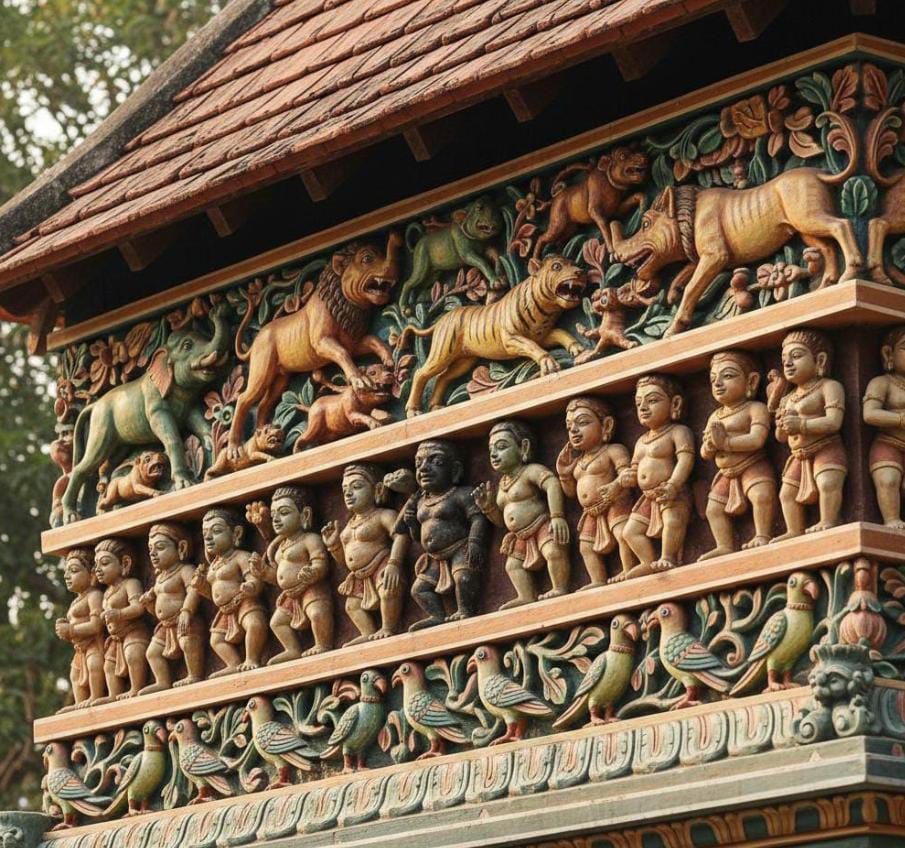 പഞ്ചമാലകൾ “ജീവന് അടിസ്ഥാനമായ പഞ്ചഭൂതങ്ങളെപ്പോലെ, ദർശനത്തിന് അടിസ്ഥാനമായ 'പഞ്ചവർണ്ണ സിദ്ധാന്ത'മാണ് കേരളീയ ചിത്രകാരന്മാർ വർഷങ്ങൾക്കുമുമ്പ് പ്രാവർത്തികമാക്കിയത്. അതുപോലെ വാസ്തുശില്പശാസ്ത്രപ്രകാരം, ക്ഷേത്രശ്രീകോവിലിൽ കാണുന്ന അഞ്ചു പ്രധാനഭാഗങ്ങൾ പൊതുവെ 'പഞ്ചമാലകൾ' എന്നു പറയുന്നു. ചിത്രശില്പകലയുമായി ബന്ധപ്പെട്ടാണ് ഇത്തരം ഭാഗങ്ങൾ പ്രാധാന്യമർഹിക്കുന്നത്. ക്ഷേത്രശ്രീകോവിലിൻ്റെ മുകൾഭാഗത്തുനിന്നും, മേൽക്കൂരയ്ക്ക് താഴെനിന്നും യഥാക്രമം മൃഗമാല, ഭൂതമാല, പക്ഷിമാല, വനമാല, ചിത്രമാല എന്നിങ്ങനെയാണ് പഞ്ചമാലകൾ. ചിത്രമാല എന്നു പറയുന്ന ഭാഗത്താണ് ചിത്രങ്ങൾ കണ്ടുവരുന്നത്. 'ചിത്രമാല'യ്ക്കാണ് പഞ്ചമാലകളിൽ പ്രാധാന്യവും. ഇവ മൂന്നു വിധം: മൃഗമാല, ഭൂതമാല, പക്ഷിമാല. ചിത്രമാലയിലെ ചിത്രങ്ങളിൽനിന്നും വ്യത്യസ്തമായി പ്രതലത്തിൽനിന്നും ഉയർന്നു നിൽക്കുന്ന-അർദ്ധറിലീഫ്-രീതിയിലാണ് ഈ മാലകൾ തയ്യാറാക്കിയിരിക്കുന്നത്. പ്രത്യേക കുമ്മായക്കൂട്ടുകൾകൊണ്ട് നിർമ്മിച്ച ഈ രൂപങ്ങൾ ചിത്രങ്ങൾക്ക് സമാനമായ വർണ്ണങ്ങൾ നൽകി ഭംഗി യാക്കിയിരിക്കും. തുടക്കംമുതൽ അവസാനംവരെ തുടർച്ചയായാണ് ഓരോ മാലയും. ശ്രീകോവിലിനെ ചുറ്റിക്കൊണ്ട് ഇത് പൂർണ്ണമാവുന്നു. മൃഗമാല: വന്യമൃഗങ്ങളെ അനുസ്മരിപ്പിക്കുംവിധത്തിൽ കൊടും കാടും കാട്ടിലെ മൃഗങ്ങളും അവയുടെ വീരപരാക്രമങ്ങളും ശണ്ഠകളും ഇണചേരലും എല്ലാം മൃഗമാലയിലെ വിഷയങ്ങളാണ്. ആന, സിംഹം, പുലി, കാട്ടുപോത്ത്, മാൻ, കുരങ്ങൻ തുടങ്ങിയ മൃഗങ്ങളാണ്പൊതുവെ കാണുന്നത്. ശൈലീകൃത രീതിയിൽ ഇവയെ ചിത്രീകരി ച്ചിരിക്കുന്നു. മൃഗങ്ങളുടെ ശൗര്യവും വേഗവും ശ്രദ്ധയും ചലനങ്ങളും ചിരി ഗംഭീരമായി ചിത്രീകരിക്കുകയും സമന്വയിപ്പിക്കുകയും ചെയ്തവയാണ് 'മൃഗമാല'കൾ. ഭൂതമാല: മൃഗമാലയെപ്പോലെതന്നെ, ചെറിയ കുറിയ മനുഷ്യരൂ പങ്ങൾകൊണ്ട് നിർമ്മിച്ചവയാണ് ഭൂതമാലകൾ. ഭൂതഗണങ്ങളെ അനുസ്മരിക്കുവാൻ പറ്റുന്ന തരത്തിൽ നിർമ്മിച്ചതിനാലാകണം ഇവയെ ഈ പേരിൽ പറയുവാൻ കാരണം. വലിയ തലയും, ചെറിയ ഉടലും ഭാവഹാവാദികൾ നിറഞ്ഞതുമായ ഈ രൂപങ്ങൾ കാഴ്ച ക്കാരനിൽ കൗതുകമുണർത്തുന്നു. പുരുഷരൂപങ്ങളും സ്ത്രീരൂപങ്ങളും ഇടകലർന്നാണ് ചിത്രീകരിക്കുക പതിവ്. ശൃംഗാരഭാവങ്ങളോടുകൂടി പ്രേമത്തിൽ മുഴുകിയിരിക്കുന്നവരും രതിക്രീഡകളിൽ ഏർപ്പെട്ടിരിക്കുന്നവരും യുദ്ധരംഗത്ത് നിലയുറപ്പിച്ചവരും ആയോധനമുറകളിൽ ഏർപ്പെട്ടിരിക്കുന്നവരും 'ഭൂതമാല'യിലെ സ്ഥിരം കഥാപാത്രങ്ങളാണ്. അപൂർവ്വമായി ഇടയ്ക്കിടെ നഗ്നരൂപങ്ങളും കണ്ടു വരുന്നു. കാഴ്ചക്കാരനിൽ കൗതുകമുണർത്തുന്നു എന്നതിലുപരി, മനുഷ്യജീവിതത്തിൻ്റെ ഗൗരവം ഓർമ്മപ്പെടുത്തുന്നതു കൂടിയാണ് ഈ ഭൂതമാലകൾ. പക്ഷിമാല: പഞ്ചമാലകളിൽപ്പെട്ട 'പക്ഷിമാല' പൊതുവെ മേൽസൂചിപ്പിച്ച രണ്ടു മാലകൾക
