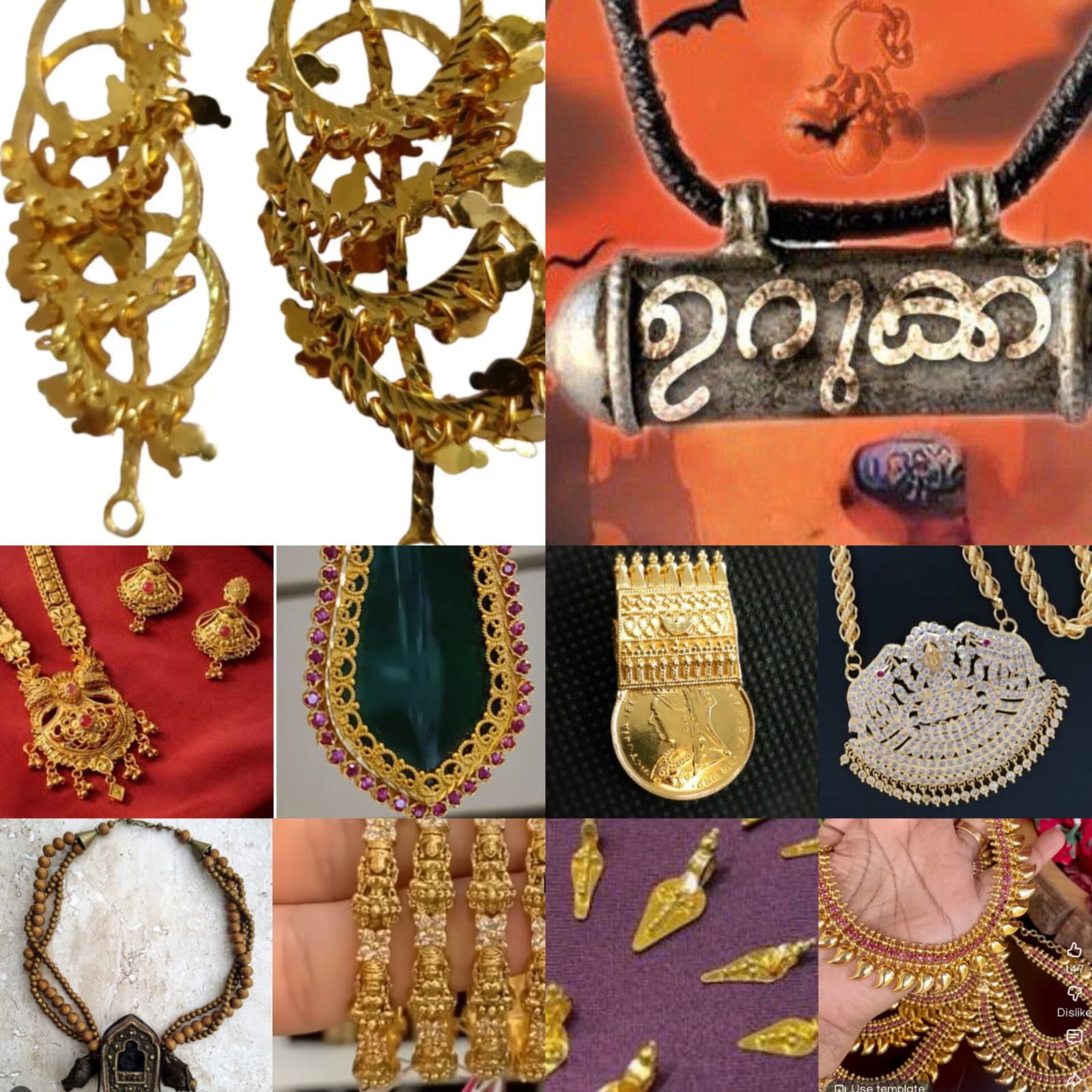 "ചരടിൽ കോർക്കുന്ന മാലകൾക്കെല്ലാം പൊതുവിൽ 'താലി' ചേർത്ത് പറയും. 'നാഗപടത്താലി' എന്നിങ്ങനെ. ദേശമംഗലം മനയ്ക്കലേക്ക്, അവിടെ താമസിച്ച് ഇത്തരം ആഭരണങ്ങൾ പണിതുകൊടുത്തിട്ടുള്ള തട്ടാന്മാരുടെ പിൻതലമുറക്കാരിൽ ചിലർ, ഇന്നും ഈ തൊഴിലിൽ നിലനില്ക്കുന്നുണ്ട്. ഹിന്ദുക്കൾക്കിടയിൽ 'താലി' ഉപയോഗിച്ചിരുന്നത് പ്രധാനമായും നമ്പൂതിരിമാരും പട്ടന്മാരും ആണ്. പില്ക്കാലത്ത്, മറ്റു ജാതിക്കാർക്കിടയിലും മംഗല്യസൂചകമായ താലിയുടെ ഉപയോഗം കടന്നു വന്നു. ഈ താലികൾക്കും ജാതിഭേദങ്ങളുണ്ട്. കമുത്തിത്താലി: മനയ്ക്കലെ പെണ്ണുങ്ങൾക്കായുള്ളതാണ്. 'ചെറുതാലി' എന്നും പറയും. ഇതിൽ ഒരു ചരടിൽ ഒരു താലി, ഒരു മണി എന്നിങ്ങനെ ഇടവിട്ട് കോർക്കുന്നു. 101 വരെ ആകാം. പൊതുവേ ആഢ്യന്മാരുടെ ആഭരണമാണിത്. ഹിന്ദുക്കൾക്കിടയിൽ പ്രചാരമുള്ളതാണ് 'മുഹൂർത്തത്താലി.' കല്യാണത്തിന് ഉപയോഗിക്കുന്ന 'താലി' എന്നേ അർത്ഥമുള്ളൂ. നമ്പൂതിരിമാരുടെ 'താലി' 'താലിക്കൂട്ടം' എന്നും അറിയുന്നു. പണ്ടാരന്മാർക്കിടയിൽ പ്രചാരത്തിലുള്ളതാണ് പൊക്കൻതാലി/പപ്പടതാലി. അതിലെ താലിക്കു കുറച്ച് വട്ടം കൂടുതലുണ്ടാകും. ഈഴവ സ്ത്രീകൾക്കിടയിൽ പ്രചാരം കുമ്പളത്താലിക്കാണ്. ഈ താലികൾക്കിടയിൽത്തന്നെ അതിൻ്റെ പുറത്തിനുള്ള മുഴുപ്പനുസരിച്ച് പേരും മാറും. അതിന് 'മുതിരപ്പുറം' എന്നൊരു പേരുണ്ട്. താലി താരതമ്യേന സമീപകാലത്താണ് ഇതരസമുദായങ്ങൾക്കിടയിൽ പ്രചാരത്തിൽ വന്നത്. ആദ്യകാലത്ത് 'സംബന്ധ'വ്യവസ്ഥയും, 'മുണ്ട്കൊട' യുമായിരുന്നു വിവാഹരീതി. 'നാഗപടത്താലി', പട്ടന്മാർക്കിടയിലും നമ്പൂതിരിമാർക്കിടയിലും ഒരുപോലെ പ്രചാരമുള്ള മാലയാണ്. മനയ്ക്കലെ ആണുങ്ങൾക്കിടയിൽ പ്രചാരമുള്ള മാലയാണ്. കാതിലണിയുന്നത് ചിറ്റാണ്. കാത് തുളച്ച് വൃത്തത്തിൽ 1/2 ഇഞ്ച് വ്യാസത്തിൽ, ഏതാണ്ട് 'U' ആകൃതിയിൽ ഒറ്റക്കാതിൽ ചിറ്റ് ഇടുന്നു. ചിലർ രണ്ടു കാതിലും ചിറ്റ് ധരിക്കാറുണ്ട്. ഇതുതന്നെ കമ്പിയിട്ട് കെട്ടുന്ന രീതിയുണ്ട്. കല്ല് വച്ച് പണിയുകയും പതിവുണ്ട്. ഏഴുകല്ല്, മൂന്ന്കല്ല്, ഒറ്റക്കല്ല് എന്നിങ്ങനെയാകാം. അതിനെ 'ചിറ്റുകടുക്കൻ' എന്ന് പറയുന്നു. പ്രായമായ നമ്പൂതിരി സ്ത്രീകൾക്കിടയിൽ 'കുഴൽത്താലി' എന്നൊരു ആഭരണം പ്രചാരത്തിലുണ്ടായിരുന്നു. കുഴൽ ആകൃതിയിലുള്ള കഷണങ്ങൾ, കോർത്തു ധരിക്കുന്ന രീതിയാണിത്. 9. 11 എന്നിങ്ങനെ സംഖ്യകളിൽ ഇതു കാണാം. കണ്ഠാഭരണങ്ങൾക്കിടയിൽ ജാതിഭേദമില്ലാതെ ഉപയോഗിക്കുന്ന നിരവധി ആഭരണങ്ങളുണ്ട്. പൂത്താലി, എല്ലാ വിഭാഗക്കാർക്കിടയിലും കാണാം. കാശുമാല, കാശിൻ്റെ ആകൃതിയിൽ രൂപപ്പെടുത്തിയ സ്വർണനാണയം, കോർത്തിടുന്ന രീതിയാണ്. അവിൽമാല, ചക്കരപ്പതക്കം, (11 കല്ലിൽ പണിയുന്ന പതക്കം-നിറം ഏതുമാവാം) വേപ്പിലുഷ, കാശാലി, ഇളക്കത്താലി, കയ്പ്പക്കുരുമാല, പണമാല, ചക്രമാല, പവൻമാല, മണിമാല, ചീർക്കു മാല, തീപ്പെട്