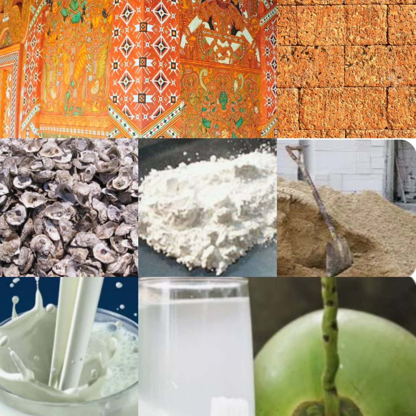 "വെട്ടുകല്ലോ, ഇഷ്ടികയോ (പണ്ടുകാലത്ത് വെട്ടുകല്ല്) വെച്ചു കെട്ടിയ ഭിത്തി പ്രതലത്തിൽ ഒരു വിരൽ (വിശ്വകർമ്മാവിൻ്റെ ഒരു വിരൽ) കനത്തിൽ (3 സെ.മീ.) കുമ്മായമിശ്രിതം തേക്കണം. കുമ്മായം: മണൽ 1:3 എന്ന ക്രമത്തിലാണ് മിശ്രിതം തയ്യാറാക്കേണ്ടത്. അടുക്കളയിൽ ഉപയോഗിക്കുന്ന അരിപ്പകൊണ്ട് മണൽ അരിച്ച് ഏറ്റവും ചെറിയ തരികൾ വേണം ഉപയോഗിക്കാൻ. ഒരു വിരൽ കനത്തിന്റെ പകുതിഭാഗം (11/2 സെ.മീ.) ഈ മിശ്രിതം കുമ്മായച്ചട്ടുകം കൊണ്ട് 'പരിക്കനായി' തേക്കുന്നു. കുമ്മായം- മണൽ മിശ്രിതം ഉണ്ടാക്കുന്നതിനുവേണ്ട വെള്ളത്തിൽ ആദ്യം ചുണ്ണാമ്പു വള്ളി (ഊഞ്ഞാൽവള്ളി) ചതച്ചിടുക. അങ്ങനെ ഒരു ദിവസം ചുണ്ണാമ്പുവള്ളി കിടന്ന വെള്ളത്തിൽ വേണം കുമ്മായ - മണൽ മിശ്രിതം തയ്യാറാക്കേണ്ടത്. കുമ്മായച്ചട്ടുകം കൊണ്ട് 'പരിക്കനായി' തേച്ച ഈ പ്രതലം ഒരാഴ്ചകൊണ്ട് ഉണങ്ങിക്കിട്ടും. പിന്നീട് കുമ്മായവും മണലും 1:2 എന്ന ക്രമത്തിലെടുത്ത് അരച്ച് വെണ്ണപ്രായത്തിലാക്കുക. ഈ കുമ്മായ മണൽ മിശ്രിതത്തിൽ കടുക്ക ചതച്ചിട്ട വെള്ളം, കറുത്ത ഉണ്ടശർക്കരവെള്ളം, (പണ്ടുകാലത്ത് ശർക്കരയ്ക്കു പകരം കരിമ്പുനീരുപയോഗിച്ചിരുന്നു) എന്നിവ ചേർത്ത് 'പഴുക്കാൻ' ഇടുക. ആദ്യം തേച്ച 11/2 സെ.മീ. കനമുള്ള പരിക്കൻ പ്രതലം ഒരാഴ്ചകൊണ്ട് ഉണങ്ങിക്കിട്ടിയതിനു മുകളിൽ ഒരു സെ.മീ. കനത്തിൽ ആ മിശ്രിതം (രണ്ടു മൂന്നു ദിവസംകൊണ്ട് പഴുത്തത്) കുമ്മായച്ചട്ടുകംകൊണ്ട് തേച്ചുപിടിപ്പിക്കുക. അത് തേപ്പുപലക കൊണ്ട് നിരപ്പാക്കുക. തേപ്പുപലകകൊണ്ടു നിരപ്പാക്കിയ പ്രതലത്തിൽ കുമ്മായച്ചട്ടുകംകൊണ്ടു മിനുക്കരുത്. ഈ പ്രതലം ഉണങ്ങിക്കിട്ടാൻ മൂന്നുദിവസം വേണ്ടിവരും. ഇനി അര സെ.മീ. കനം ബാക്കിയുണ്ട്. കക്ക നീറ്റിയെടുത്ത ചുണ്ണാമ്പുകുഴമ്പ് വെള്ളത്തിൽ കലക്കുക. മുകളിലത്തെ കരട് മാറ്റിക്കളഞ്ഞ്, ഈ വെള്ളം വേറൊരു പാത്രത്തിലേക്കു പകരുക. അടിയിലെ കരടും കക്കയുടെ ഭാഗവും കളഞ്ഞ് കിട്ടുന്ന ചുണ്ണാമ്പുവെള്ളം ഒരു മണിക്കൂർ ഊറാൻ വെച്ചാൽ മുകളിൽ വെള്ളം തെളിഞ്ഞുനിൽക്കും. ഈ വെള്ളം കളഞ്ഞാൽ അടിയിൽ വെണ്ണപോലുള്ള ശുദ്ധ ചുണ്ണാമ്പുകുഴമ്പ് ഊറിക്കിട്ടും. വെള്ളമില്ലാത്ത ഈ ചുണ്ണാമ്പിൽ പൂളപ്പഞ്ഞിക്കുരു കരടും കളഞ്ഞ് ചേർക്കുക. ഇതിൻ്റെ അനുപാതം ചുണ്ണാമ്പ് : പഞ്ഞി 3:1 എന്നാണ്. ഈ മിശ്രിതം അമ്മിയിൽ വച്ചരച്ച് ഈരിഴത്തോർത്തിൽ അരിച്ചെടുക്കുക. ബാക്കിയുള്ള 1/2 സെ.മീ. കനത്തിൻ്റെ മുക്കാൽഭാഗം (രണ്ടു പപ്പടക്കനം) ഈ മിശ്രിതം തേച്ചുപിടിപ്പിക്കുക. ഇത് വീതിയുള്ള സാധാരണ ബ്രഷുകൊണ്ട് തേക്കാം. പഞ്ഞിയുള്ളതിനാൽ ഈ പ്രതലം ഏകദേശം ക്യാൻവാസിനു തുല്യമായി ലഭിക്കും. ഇത് ഒരാഴ്ച്ച കൊണ്ട് ഉണങ്ങിക്കിട്ടും. കക്ക നീറ്റിയെടുത്തു വെണ്ണപോലെയാക്കിയ ശുദ്ധ ചുണ്ണാമ്പുകുഴമ്പിൽ ഇളനീർവെള്ളം ചേർത്ത് ഒരു ലായനി ഉണ്ടാക്കുക. ഇതിൻ്റെ സാന്ദ്രത പശുവിൻ പാല