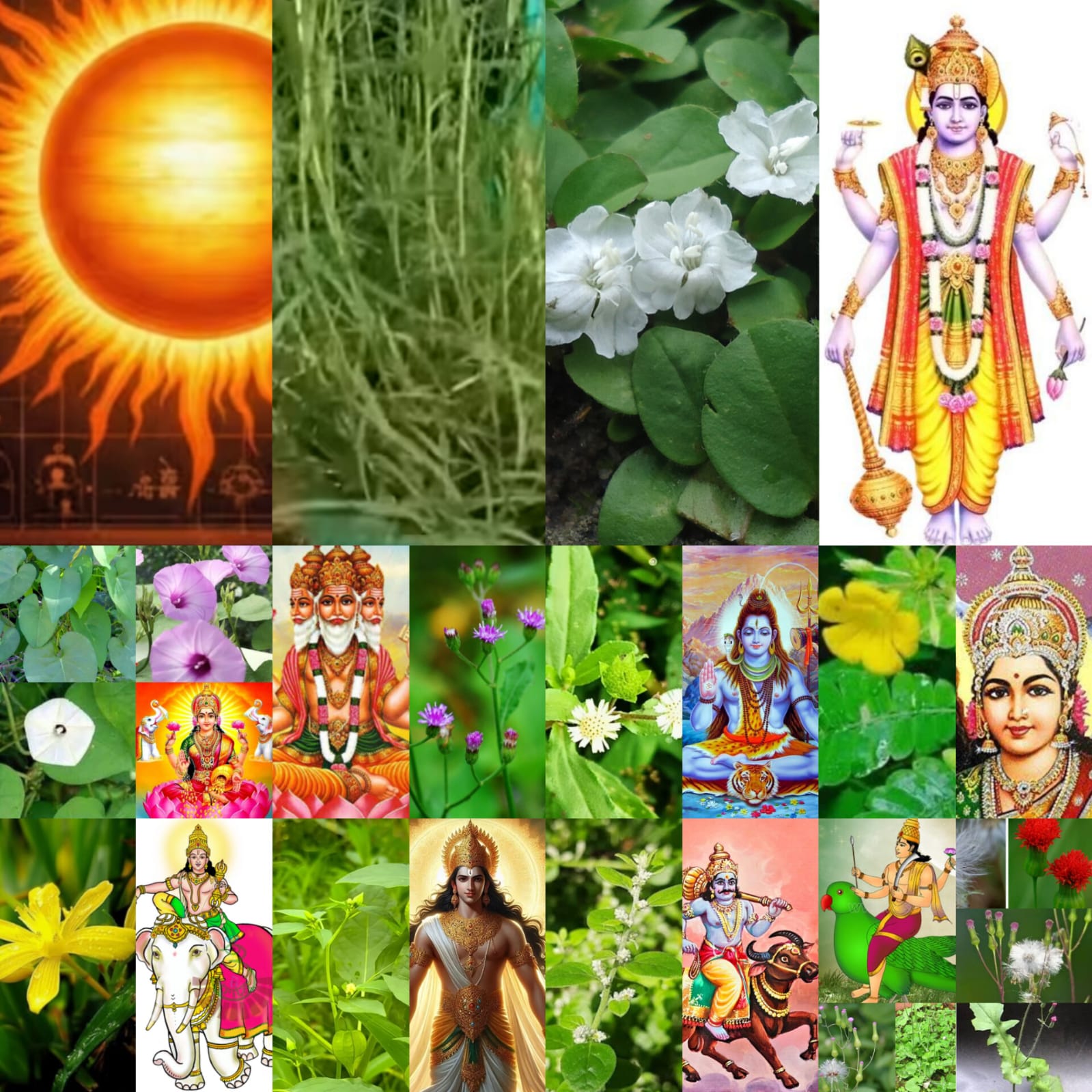 1. കറുക (ദുർവ്വ): നിലത്തു പറ്റിച്ചേർന്നു വളരുന്ന അതിപ്രധാനമായ ഒരു ഔഷധസസ്യം.