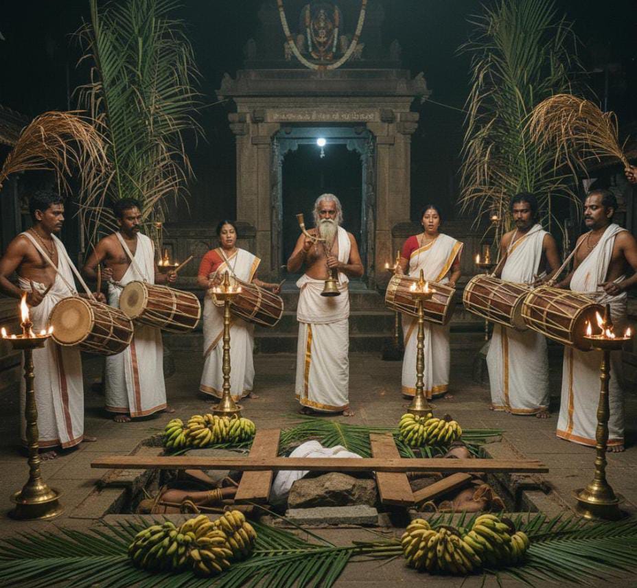ജീവനോടെതന്നെ ആ കുഴിയിൽ കിടത്തും. കുഴി മൂടും. അതിനു ശേഷം പലകവയ്ക്കുന്നു. അതിൻ്റെ പുറത്ത് കല്ലുംവയ്ക്കും. രാത്രിയിലാണ് ഈ ചടങ്ങ് പതിവ്. കുഴികുത്താനും വെളിച്ചം കാണിക്കാനുംപരവനാണ് അവകാശം. ഉണക്കപ്പുല്ല് പിന്നിമെടഞ്ഞ് അത് കത്തി ച്ചായിരുന്നു വെളിച്ചം കാണിക്കുന്നത്. ഈ സമയത്ത് വേലത്തിമാർ കൊട്ടിപ്പാടിക്കൊണ്ടിരിക്കും. ഒരു മൊഴിതെറ്റിയാൽ അവരുടെ ആണുങ്ങൾ മരിക്കും എന്നാണു വിശ്വാസം. വ്രതശുദ്ധിയോടെ വേണം ഇതാചരിക്കാൻ. പിറ്റേന്ന് രാവിലെ ആണുങ്ങൾ കുലച്ചവാഴ, പന, ചൂരൽ എന്നിവയുമായി വരും. അത് സമൃദ്ധിയെ കാണിക്കുന്നു. അവരുടെ ദേവൻമാർ വരുന്നു എന്ന വിശ്വാസം.”