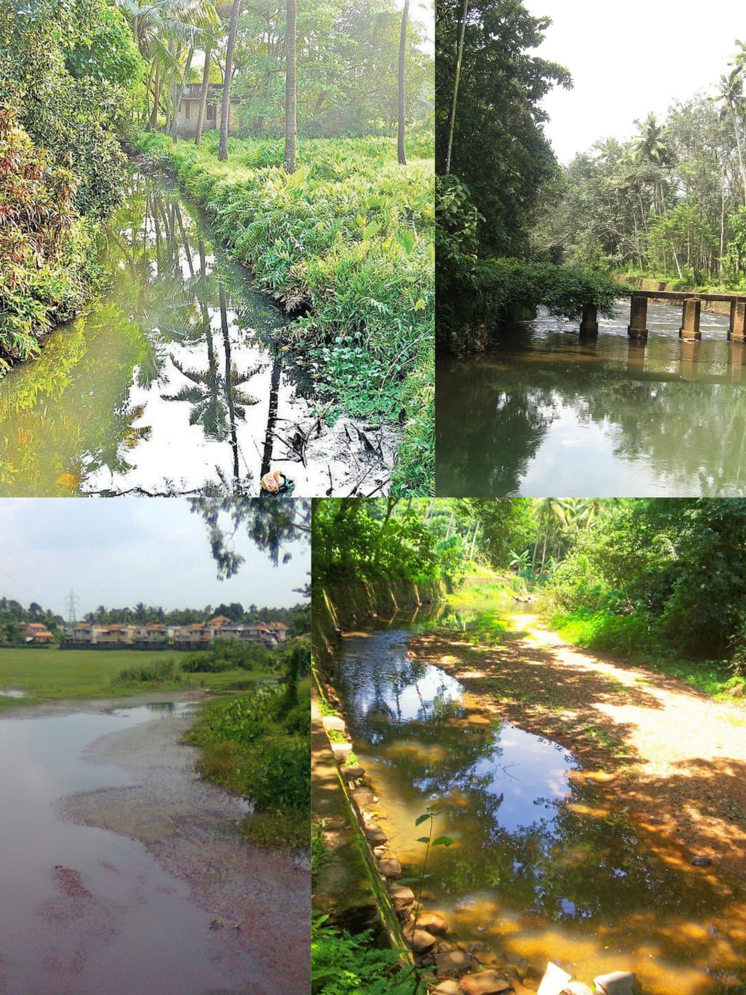 (1) ചെറുതോടുകൾ: ഇവയിലധികവും ചെറുകുളങ്ങളിൽനിന്നും തുടങ്ങുന്നവയാണ്. ചിലയിടത്ത് ചെറിയ, ഒറ്റപ്പെട്ട വയലിൽനിന്നോ ഞാറ്റുകളളികളിൽ നിന്നോ ഇത് ആരംഭിക്കുന്നു. പരമാവധി 2 മീറ്റർവരെ വീതിയും 1 മീറ്ററോളം ആഴവും ഇവയ്ക്കുണ്ടാവും. മണൽപ്രദേശമാകയാൽ മഴക്കാലത്തെ പെയ്ത്തുവെള്ളമത്രയും ഈ കുളങ്ങളിലേക്കും തോടുകളിലേക്കും കിനിഞ്ഞിറങ്ങും. കുളത്തിൽ ഉറവുപിടിക്കുന്നതോടെ മഴക്കാലത്ത് ഈ തോടുകളിലൂടെ ഒഴുക്കു തുടങ്ങുകയായി.