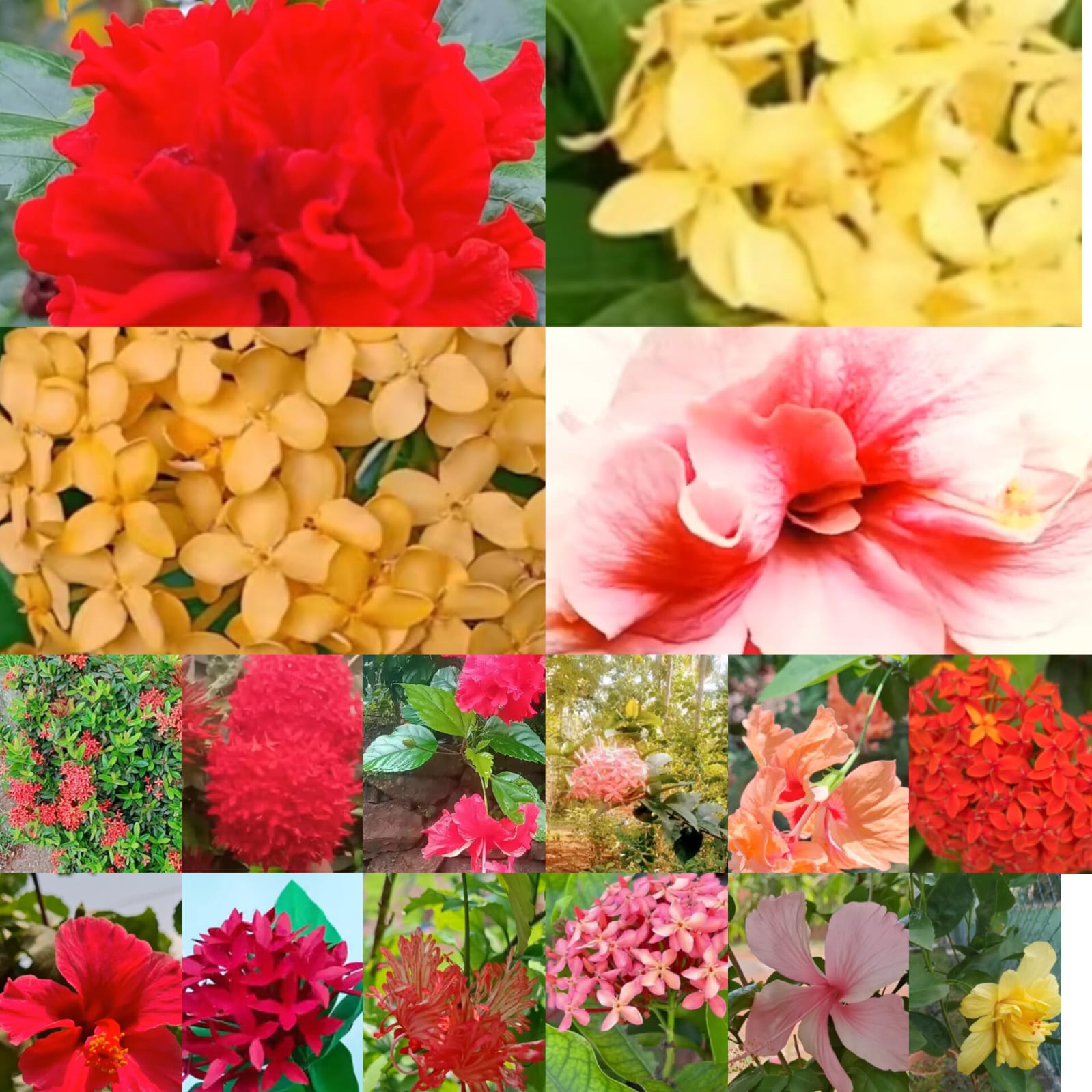 1. കറുക (ദുർവ്വ): നിലത്തു പറ്റിച്ചേർന്നു വളരുന്ന അതിപ്രധാനമായ ഒരു ഔഷധസസ്യം. 2. കൃഷ്ണ(വിഷ്ണു)ക്രാന്തി: വരണ്ടമണ്ണിൽ നിലത്തു പടർന്നു വളരുന്ന ഒരു സസ്യം. ചെറിയ (നീലനിറത്തിലുള്ള) പൂക്കളുണ്ടാവും. 3. തിരുതാളി: വെളുത്ത പൂവുണ്ടാവുന്ന ഒരു വള്ളിച്ചെടി 4. പൂവ്വാംകുറുന്നില: എല്ലാ സ്ഥലങ്ങളിലും വളരും 5.കയ്യോന്നി (കഞ്ഞുണ്ണി) 6. മുക്കൂറ്റി: മഞ്ഞപൂക്കളോടുകൂടി എല്ലാ സ്ഥലത്തും വളരുന്നു. 7. നിലപ്പന: നിലത്തു പടർന്നു വളരുന്നു. 8. ഉഴിഞ്ഞ: ഒരു വള്ളിച്ചെടി 9. ചെറുവൂള: ഇലഞെട്ടിൽ വെളുത്ത പൊടി പറ്റിപ്പിടിച്ചിരിക്കുന്ന പോലെ പൂക്കൾ കാണും. 10. മുയൽച്ചെവി (മോച്ചമി): ഇവയെയാണ് ദശപുഷ്പങ്ങൾ എന്നു പറയുന്നത്. ഈ ദശപുഷ്പങ്ങൾ ഓരോന്നും ഓരോ ദേവതമാരെ പ്രതിനിധാനം ചെയ്യുന്നു. ഓരോന്നും വളരെയധികം ഔഷധഗുണങ്ങൾ ഉള്ളതുമാണ്. ഈ പത്തു പൂക്കളിൽ ഏതെങ്കിലും ഒന്നു കിട്ടിയില്ലെങ്കിൽ പകരം തുളസി മതി. 1. കറുക: ആദിത്യദേവനെ പ്രതിനിധാനം ചെയ്യുന്നു. ദശപുഷ്പങ്ങളിൽ ഏറ്റവും പ്രധാനം. കറുക പല തരത്തിലുണ്ട്. വെൺകുറുക രക്തപ്രസാദിനിയാണ്. ത്വഗ്രോഗങ്ങളകറ്റാൻ കറുക ഉത്തമം. പ്രമേഹം-പ്രഷർ എന്നിവയുടെ സംഹാരിയാണ്. ആരോഗ്യത്തിനുത്തമം. തലയിൽ ചൂടാൻ മാത്രമല്ല, ഭക്ഷണത്തിനും നല്ലതുതന്നെ. ബലിപ്പുല്ലായും ഉപയോഗിക്കുന്നുണ്ട്. ഗണപതിക്കു വളരെ പ്രിയപ്പെട്ടതാണ് കറുക എന്നു പുരാണകഥകൾ പറയുന്നുണ്ട്. 2. കൃഷ്ണ (വിഷ്ണു) ക്രാന്തി: മഹാവിഷ്ണുവാണ് ദേവൻ. കഫക്കെട്ട്, ജ്വരം എന്നിവയെ ശമിപ്പിക്കും. മുടിക്ക് ഉത്തമം. 3. തിരുതാളി: ലക്ഷ്മീദേവിയാണ് ദേവത. ഐശ്വര്യദായിനിയാണ്. ബുദ്ധിക്കും മുടിയഴകിനും ഉത്തമം. 4. പൂവ്വാംകുറുന്നില: ബ്രഹ്മാവാണ് ദേവൻ. 'പൂവ്വാങ്കുറുന്നിലയ്ക്കു പടിപ്പുരപൊന്ന് ' എന്നാണ് ചൊല്ല്. ഇതു തലയിൽ ചൂടുന്നത് ഐശ്വര്യദായകമാണ്. ദാരിദ്ര്യദുഃഖങ്ങളകലാൻ ഉത്തമം. ജലദോഷം, പനി എന്നിവയ്ക്ക് പ്രായഭേദമെന്യേ പൂവ്വാങ്കുറുന്നില ഉപയോഗിക്കുന്നു. പ്രത്യേകിച്ച് ചെറിയകുട്ടികൾക്ക് ജലദോഷം, പനി എന്നിവയ്ക്ക് കഷായം വെച്ചു കൊടുക്കുന്നു. എണ്ണ കാച്ചാനും വെള്ളം തിളപ്പിച്ച് കുടിക്കാനും കൺമഷിയുണ്ടാക്കാനും ഈ സസ്യം ഉപയോഗിക്കുന്നു. കണ്ണിനു കുളിർമ്മ നൽകുന്നു. 5- കുയ്യോന്നി (കഞ്ഞുണ്ണി): ശിവനെ പ്രതിനിധാനം ചെയ്യുന്നു. ശിരോരോഗസംഹാരിയാണ്. കഫ, വാതരോഗങ്ങൾക്കുപയോഗിക്കുന്നു. കാഴ്ചശക്തി വർദ്ധിപ്പിക്കും. തലമുടി വളരാൻ ഉത്തമം. 6. മുക്കുറ്റി ശ്രീപാർവ്വതിയാണ് ദേവത. ഇതു തലയിൽ ചൂടിയാൽ കുടുംബസൗഖ്യം ഫലം. നീരെടുത്ത് നെറ്റിയിൽ പൊട്ടുതൊടാറുണ്ട്. ശരീരകാന്തിക്കുത്തമം. താരൻനിവാരിണിയാണ്. 7. നിലപ്പന: ഭൂമിദേവി ദേവത. ഇതു തലയിൽ ചൂടിയാൽ ക്ഷമ, വിവേകം എന്നിവയുണ്ടാവും. ശരീരപുഷ്ടിയും ബലവുമുണ്ടാകും. തല-ചെവി - വേദനസംഹാരി, സ്ത്രീസഹജമായ രോഗങ്ങൾക്കുത്തമം. 8. ഉഴിഞ്ഞ: ഇന്ദ്രനാണ് ദേവൻ. സ