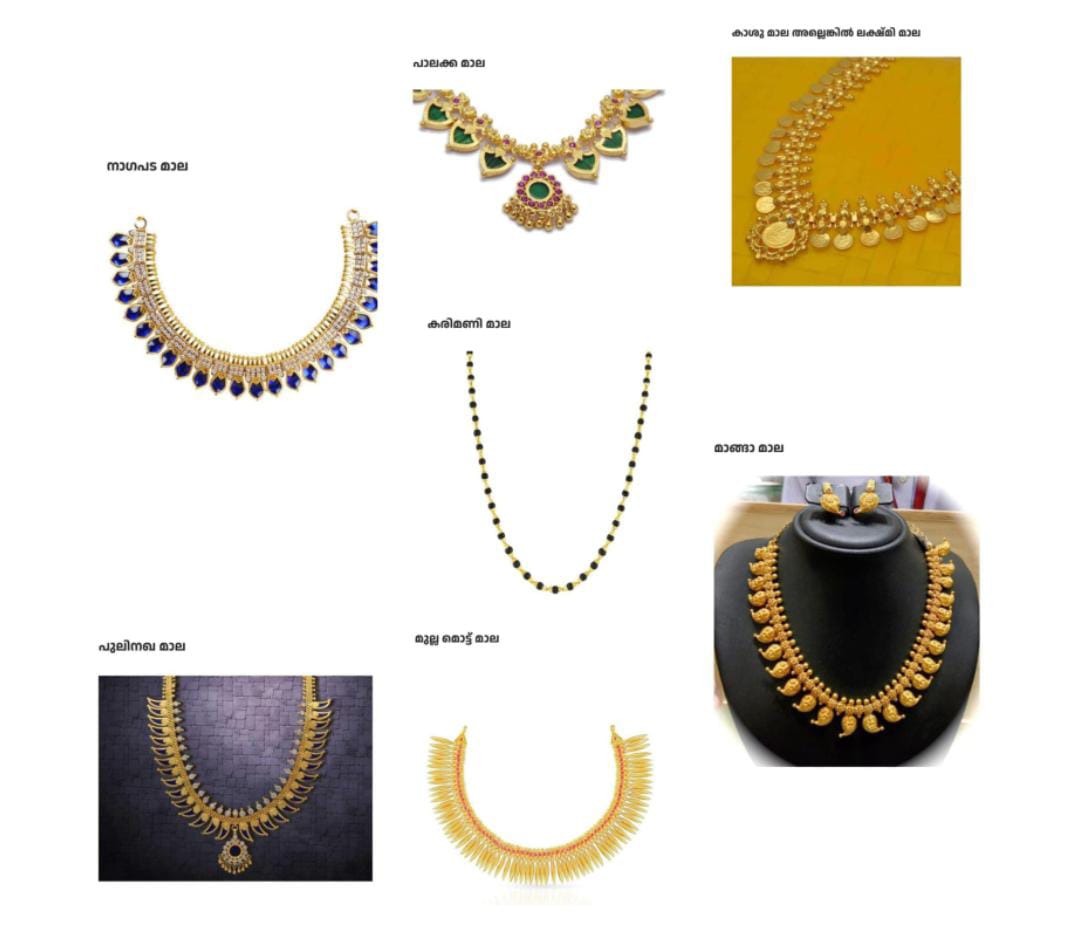 പൂത്താലി, എല്ലാ വിഭാഗക്കാർക്കിടയിലും കാണാം. കാശുമാല, കാശിൻ്റെ ആക്യതിയിൽ രൂപപ്പെടുത്തിയ സ്വർണനാണയം, കോർത്തി ടുന്ന രീതിയാണ്. അവിൽമാല, ചക്കരപ്പതക്കം, (11 കല്ലിൽ പണിയുന്ന പതക്കം-നിറം ഏതുമാവാം) വേപ്പിലുഷ, കാശാലി, ഇളക്കത്തൊലി കയ്പ്പ്പക്കുരുമാല, പണമാല, ചക്രമാല, പവൻമാല, മണിമാല, ചീർപ്പു നിരവധി പ്രചാരത്തിലുണ്ടായിരുന്നു. ഇന്ന് ഈ പഴയ ആഭരണങ്ങളുടെ മാല, തീപ്പെട്ടിമാല, കുഴിഡബ്ബിൾ മാല എന്നിങ്ങനെ കണ്ഠാഭരണങ്ങൾ പുതിയ പതിപ്പുകൾ, കാലഭേദമനുസരിച്ചുള്ള പുതുമകളോടെ കടന്നുവരുന്നു.