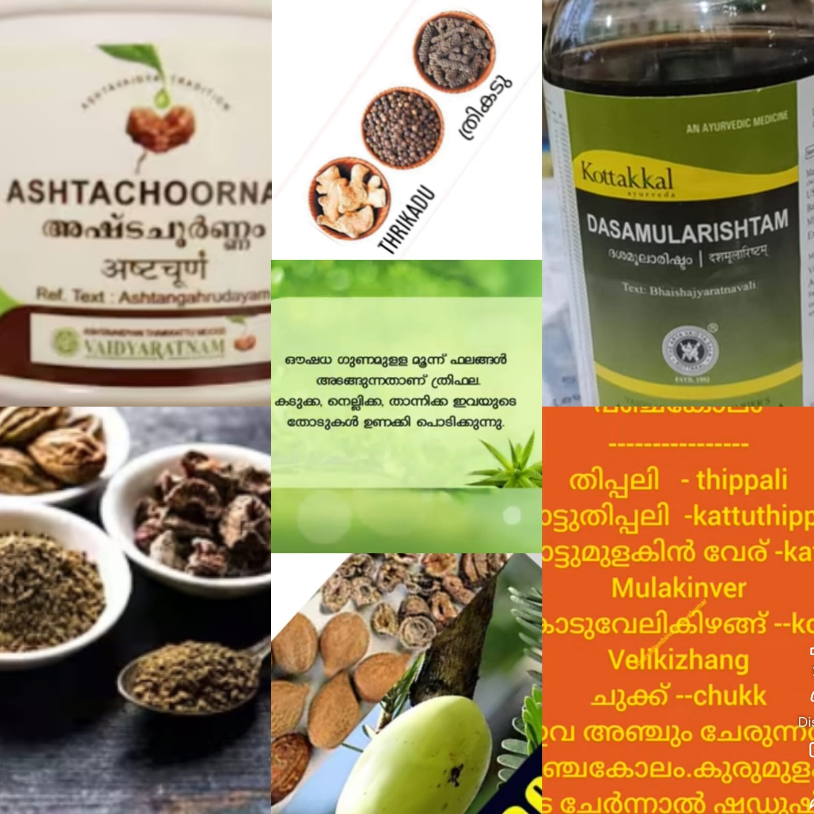 ദശമൂലം "ഒട്ടേറെ ആയുർവേദ ഔഷധച്ചേരുവകളിൽ വരുന്ന ഒന്നാണിത്. ഒമ്പതെണ്ണത്തിൻ്റെയും വേരും ഞെരിഞ്ഞിലിൻ്റെ മാത്രം കായും ആണ് ഉപയോഗിക്കുന്നത്. പത്തും ചേരുമ്പോൾ ശരീരത്തിൻ്റെ എല്ലാ പ്രവർത്തനങ്ങളും ക്രമപ്പെടുത്തുന്നു. ആദ്യത്തെ അഞ്ചെണ്ണം മഹാപഞ്ചമൂലമെന്നും ശിഷ്ടം ഹ്രസ്വ പഞ്ചമൂലമെന്നുമാണ് അറിയപ്പെടുന്നത്. 1. കുമിഴ് മെലൈന ആർബോറിയ 2. കൂവളം ഈഗിൾ മാർമെലോസ് 3. പാതിരി സ്റ്റീരിയോസ്പെർമം ചെലെനോയ്ഡസ് 4. പലകപ്പയ്യാനി ഓറോസൈലം ഇൻഡിക്കം 5. മുഞ്ഞ പ്രെംന കോറിംബോസ 6. ഓരില ഡെസ്മോഡിയം ഗാഞ്ചെറ്റിക്കം 7. മൂവില സ്യൂഡാർത്രിയ വിസിഡ 8. ചെറുവഴുതിന (കറുത്ത ചുണ്ട) സൊളാനം മെലോൻജിന വൈറൈറ്റി ഇൻസാനം 9. പുത്തരിച്ചുണ്ട (വെളുത്ത ചുണ്ട) സൊളാനം ആൻഗ്വിയെ 10.ഞെരിഞ്ഞിൽ ട്രിബുലസ് ടെറസ്ട്രിസ് ശിശിരദ്വയം: രണ്ടിനം ചന്ദനങ്ങളെയാണിവിടെ വിവക്ഷിക്കുന്നത്. ചന്ദനം (സന്റാലം ആൽബം), രക്തചന്ദനം (റ്റിറോകാർപസ് സൻ്റാലെൻസിസ്) ഇവ രണ്ടും ശീതീകാരികളും ചർമ്മസംരക്ഷണം നടത്തുന്നവയുമാണ്. പഞ്ചകോലം: തിപ്പലി - പൈപ്പർ ലോങ്ഗം - ഉണങ്ങിയ തിരി കാട്ടുതിപ്പലി - പൈപ്പർ ലോങ്ഗം - വേര് കാട്ടുമുളക് - പൈപ്പർ അറ്റന്യുവേറ്റം - വേര് കൊടുവേലി - പ്ലംബാഗോ റോസിയ - വേര് ചുക്ക് - സിഞ്ചിബർ ഒഫീസിനേൽ - ഉണക്കിയ കിഴങ്ങ് ത്രികടു: ഉഷ്ണപ്രധാനമായതും നീരിനെ ഇല്ലാതാക്കുന്നതുമായ ഔഷധക്കൂട്ട്. 1. ചുക്ക് 2 മുളക് (കുരുമുളക്) 3. തിപ്പലി. ത്രിഫല: മൂന്നിനം ഫലങ്ങളുടെ തൊണ്ടുണക്കിയെടുത്തതാണ് ത്രിഫല. ത്രിഫലപ്പൊടി ചെറിയ അളവിൽ ദിവസവും കഴിക്കുന്നത് വയർ ശുദ്ധമാക്കുന്നു, മലബന്ധം നീക്കുന്നു, മൂലക്കുരുവിൻ്റെ ശല്യം കുറയ്ക്കുന്നു. ഇതിന്റെ കഷായം കവിൾകൊള്ളുന്നത് വായപ്പുണ്ണിനു നല്ലതാണ്. ഇതുകൊണ്ടു മുറിവു കഴുകുന്നത് മുറിവു പഴുക്കാതിരിക്കാൻ നല്ലതാണ്. നേത്രരോഗചികിത്സയിൽ ത്രിഫലയ്ക്കുള്ള സ്ഥാനം അദ്വിതീയമാണ്. കടുക്ക - ടെർമിനാലിയ ചെബുല നെല്ലിക്ക - ഫില്ലാന്തസ് എംബ്ലിക്ക താന്നിക്ക - ടെർമിനാലിയ ബെല്ലറിക്ക "