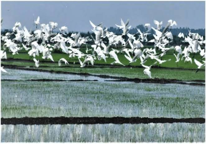 " വെള്ളം വാർത്തിട്ട ഞാറ്റടിയിലും വാർത്തുവിത നടത്തിയ കണ്ടങ്ങളിലും കൂട്ടംകൂട്ടമായി പറന്നിറങ്ങുന്ന അമ്പലപ്രാവുകൾ ഒരു സാധാരണ കാഴ്ചയാണ്. മകരക്കൊയ്ത്തു കഴിഞ്ഞ പാടത്ത് കൊഴിഞ്ഞു കിടക്കുന്ന നെന്മണി പെറുക്കാനും ഇവരെത്തുന്നു. ജലാശയങ്ങളിലെ പര്യടനവും പരിശോധനയും കഴിഞ്ഞ് ഒളിഞ്ഞും മറഞ്ഞും കടന്നുവരുന്ന കുളക്കോഴികളുണ്ട്. കൊയ്ത്തുപാടങ്ങളിൽനിന്നും ഗത്യന്തരമില്ലാതെ ചാടിയും പറന്നും പോവുന്ന പുൽപോന്തിനെയും (പച്ചത്തുള്ളൻ) പാറ്റകളെയും, തവളക്കുട്ടികളെയും കൊത്തിവിഴുങ്ങാനെത്തുന്ന കിളികളുടെ കൂട്ടം പാടത്തെ കൗതുകകരമായ കാഴ്ചയാണ്. എപ്പോഴും എവിടെയും പറന്നെത്തുന്ന കാക്കക്കൂട്ടങ്ങൾക്ക് വയലിനോടുള്ള ബന്ധം ഒഴിവാക്കാനാവുകയില്ല. തക്കം പാർത്ത് കാത്തിരിക്കുന്ന കാക്കക്കുയിലുകളും പാടവരമ്പിലെ ചെറുപൊന്തകളിൽ ഒളിഞ്ഞിരിക്കുന്ന ഓന്തിനും പുഴുക്കൾക്കും പാമ്പിൻകുട്ടികൾക്കും ശത്രുവായി പതുങ്ങിയെത്തുന്ന ചെമ്പോത്തുകളും (ഉപ്പൻ, ചകോരം) നിത്യവും വയലിന്റെ സന്ദർശകപ്പട്ടികയിൽ പേരു ചേർക്കപ്പെട്ടവരാണ്. വയലുഴുതു നിരത്തുമ്പോൾ ഞണ്ടും തവളയും താവളം നഷ്ടപ്പെട്ട് ഉഴലുന്നു. അവയെ റാഞ്ചിയെടുക്കാനായി ഊളിയിട്ടിറങ്ങുന്ന കൃഷ്ണപ്പരുന്തിനെയും മറന്നു കൂടാ. ഉഴുത് വെള്ളം കെട്ടിയിട്ട പാടശേഖരത്തിലേക്ക് ദേശാടനക്കാരായി പലരും പറന്നെത്തുന്നു. അവർ വന്നും പോയും കഴിയുന്നു. അവരെല്ലാം വിരുന്നുകാരാണ്. വീട്ടുകാരിൽ ചിലരെ പരിചയപ്പെടാം. കൊറ്റി പാടത്തെത്തുന്ന പറവകളുടെ കൂട്ടത്തിൽ പ്രഥമഗണനീയനാണ് കൊക്ക്. പലതരം കൊക്കുകൾ പുലർകാലത്തുതന്നെ എത്തിച്ചേരാറുണ്ട്. ഉഴവു നടക്കുമ്പോഴും പുഞ്ചക്കണ്ടങ്ങളിൽ പുഴുക്കളെയും പാറ്റകളെയും മത്സ്യക്കുഞ്ഞുങ്ങളെയും തവളക്കുഞ്ഞുങ്ങളെയും തേടിയെത്തുകയാണവ. കൊയ്ത്തുകാലങ്ങളിൽ കതിർപാടത്തു നിന്നും പറന്നുയരുന്ന ചെറുപ്രാണികളെയും ഇവ ലക്ഷ്യമിടുന്നു. മുതുകിൽ ചാരനിറവും വയറിൻ്റെ ഭാഗത്ത് കറുപ്പു നിറത്തിലുള്ള വരകളും ഉള്ള കുളക്കൊക്കെന്നറിയപ്പെടുന്ന ചെറിയതരം കൊക്കുകൾ പാടത്തെ പ്രധാനികളാണ്. പറക്കുമ്പോൾ ചിറകുകളുടെ അടിവശം വെളുപ്പുനിറമാണ്. ശിരസ്സിൽ എഴുന്നുനില്ക്കുന്ന രണ്ടുമൂന്ന് മുടിയിഴകളും ചെറിയ കണ്ണുകളും മഞ്ഞനിറത്തിലുള്ള കൊക്കും നീളം കുറഞ്ഞ കാലുകളും ഇതിൻ്റെ പ്രത്യേകതയാണ്. കുരുവി ഇടതടവില്ലാത്ത ശബ്ദഘോഷത്തോടെ, വിശ്രമമില്ലാത്ത പ്രവർത്തനങ്ങളോടെ, ആവേശവും ചുറുചുറുക്കും കൂടപ്പിറപ്പായ 'തൂക്കണാം കുരുവി' എന്ന് തമിഴിലും, 'നെല്ലോലകുരുവി'യെന്നും 'അടയ്ക്കാക്കിളി'യെന്നും മലയാളത്തിലും വിളിക്കുന്ന കുരുവികൾ നെൽപ്പാടത്തിന്റെ നിത്യസന്ദർശകപ്പട്ടികയിൽ പ്രാധാന്യത്തോടെ നിലനിൽക്കുന്നു. പാടവരമ്പത്തെ തെങ്ങോലകളിലായാലും മരച്ചില്ലകളിലായാലു