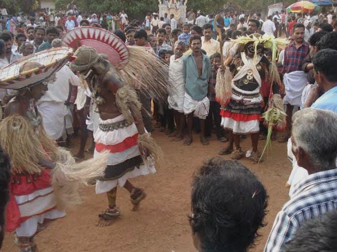 “മലയരയന്മാരുടെ ഒരു അനു ഷ്ഠാനപരമായ ഉത്സവം. അവർ ആരാധിക്കുന്ന മലദൈവങ്ങളുടെ പ്രതിമകൾവെച്ച് പൂജിക്കുകയും പാട്ടുപാടി ചുറ്റും കളിക്കുകയും ചെയ്യും. തേൻ, കാട്ടുകിഴങ്ങുകൾ തുടങ്ങിയവ നിവേദ്യമായി കാഴ്ചവയ്ക്കും. ഒരുതരം പ്രാകൃത നൃത്തമാണ് അവർ നടത്തുക. കാട്ടുമരത്തൂപ്പുകളും മറ്റും അരയിലും തലയിലും വച്ചുകെട്ടിയിരിക്കും”.