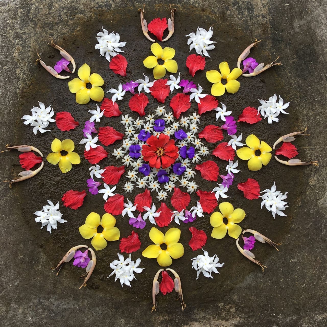 " ചെത്തി, മന്ദാരം, പവിഴമല്ലി, നന്ത്യാർവട്ടം, ചെമ്പരത്തി തുടങ്ങിയവ ഏതു തൊടിയിലുമുണ്ടാകും. ഇവ സമൃദ്ധമായി ഓണക്കാലത്തു പൂക്കുകയും ചെയ്യും. എങ്കിലും കുട്ടികൾ പൂക്കളത്തിനുവേണ്ടി സംഭരിക്കുന്ന പൂക്കൾ മിക്കവാറും ഈയിനങ്ങളിൽ പെട്ടവയല്ല. ഇവയുടെ ഇതളുകളുടെ വലിപ്പം കൂടുതലാണ്. ഇവയാണെങ്കിൽ വേഗത്തിൽ പറിച്ചെടുത്തു സമയം ലാഭിക്കാം. എന്നിട്ടും ഈ പൂക്കളെയെല്ലാം ഒട്ടൊക്കെ അവഗണിച്ച് തുമ്പ, മുക്കുറ്റി, കൊങ്ങിണിപ്പൂവ്, കാക്കപ്പൂവ്, അപ്പപ്പൂവ് എന്നീ പേരുകളിലറിയപ്പെടുന്ന വളരെ ചെറിയ വലിപ്പമുള്ള പൂക്കൾ പറിക്കാനാണ് അവർ സമയം കളഞ്ഞിരുന്നത്. ഇവയൊന്നും വേഗം പൊട്ടിച്ചെടുക്കാൻ ആവില്ല. ഇവയെല്ലാം നുള്ളിയെടുക്കണം. തലേ ദിവസം പൂക്കൾ ഓരോന്നായി നുള്ളിയെടുത്ത് ഇലക്കുമ്പിളിലാക്കി അടുത്ത ദിവസം രാവിലെ ഉപയോഗിക്കാനായി വെള്ളം തളിച്ചുവെക്കുന്നു. ഓരോയിനം പൂവിനും പ്രത്യേകം പ്രത്യേകം ഇലക്കുമ്പിളുകളുണ്ടാകും. ചെറിയ പൂക്കൾ നുള്ളുമ്പോൾ ധാരാളം സമയം ആവശ്യമായി വരുന്നതിനാൽ അതൊരു പ്രധാന ജോലിയായി മാറുന്നു. അന്നെല്ലാം വേഗം വളരെക്കുറഞ്ഞ സാമൂഹ്യകാലവും വ്യക്തിസമയവും ആണ് ഉള്ളത്. ഈ ഘടകം വിദ്യാഭ്യാസരീതിയും സാമൂഹ്യഘടനയും മാറിയതോടെ വ്യത്യാസപ്പെട്ടു. മേഞ്ഞു നടക്കാൻ അന്നുണ്ടായിരുന്ന പുൽമേടുകളും ഇല്ലാതായി. അതോടെ സ്ഥലവും കാലവും മാറി. വീട്ടിലെ സ്ഥലകാലങ്ങളിൽ കുട്ടികൾ ഒതുങ്ങി, സ്ഥലകാലങ്ങളുടെ വിസ്തൃതി നഷ്ടപ്പെട്ടു. സാമൂഹ്യമാറ്റത്തിൻ്റെ അനിവാര്യതയാണത്. പൂക്കൾ തേടി നടന്നിരുന്ന കുട്ടികൾ പ്രകൃതിയുമായി സ്നേഹ ബന്ധം പുലർത്തിയിരുന്നു. ഒപ്പംതന്നെ ഗ്രാമത്തിലെ കുട്ടികളുടെ കൂട്ടായ്മയും വളർന്നിരുന്നു. അവരൊരുമിച്ചു പൂ പറിക്കാൻ പോയി. കിട്ടിയ പൂക്കൾ പങ്കുവെക്കുകയും അത് സ്വന്തം വീട്ടുമുറ്റത്തു പൂക്കളമാക്കി മാറ്റുകയുമായിരുന്നു, പതിവ്. പങ്കുവെക്കാനുള്ള ഒരു മാനസികഭാവം അതിലൂടെ അറിയാതെതന്നെ കുട്ടികൾ ആർജ്ജിക്കുന്നു. എല്ലാവരും ഒരുപോലെ എന്നു പാടാൻ പിന്നെ പ്രയാസമില്ല. പൂക്കളം മിക്കവാറും ജ്യോമിട്രി രൂപങ്ങളിലാണ് ഒരുക്കിയിരുന്നത്. വൃത്തം, ചതുരം, ത്രികോണം തുടങ്ങിയ രൂപങ്ങളായിരിക്കും പ്രധാനം. ഈ വിധ ആകൃതികൾ ഭൂമിയുടെയും കാലത്തിൻ്റെയും ഉർവ്വരതയുടെയും ചിഹ്നങ്ങളായി മിക്കവാറും എല്ലാ നാടൻ കലകളിലും പ്രത്യക്ഷപ്പെടാറുണ്ട്. പലപ്പോഴും ഇവയുടെ ദൃശ്യതാളത്തിലുള്ള ക്രമീകരണം അലങ്കാരധോരണിയിൽ പ്രധാനമാണ്. ഭൂമിയെ അലങ്കരിക്കുന്നവയാണിവ. ഗുപ്തജ്ഞാനമുൾക്കൊള്ളുന്ന മന്ത്ര-തന്ത്ര-യന്ത്രവിധികളിൽ കളം വരയ്ക്കാറുണ്ട്. അതിലും അടിസ്ഥാന രൂപങ്ങൾ ജ്യോമിട്രിക് ആകൃതികളാണ്. അവയെല്ലാം ഉന്നത പൗരോഹിത്യത്തിന്റെയും രഹസ്യാത്മകതയുടെയും മേഖലകളിൽ നിലകൊള്ളുമ്പോൾ പൂക്കളംപോലുള്ളവ കുട്ടികളുടെ